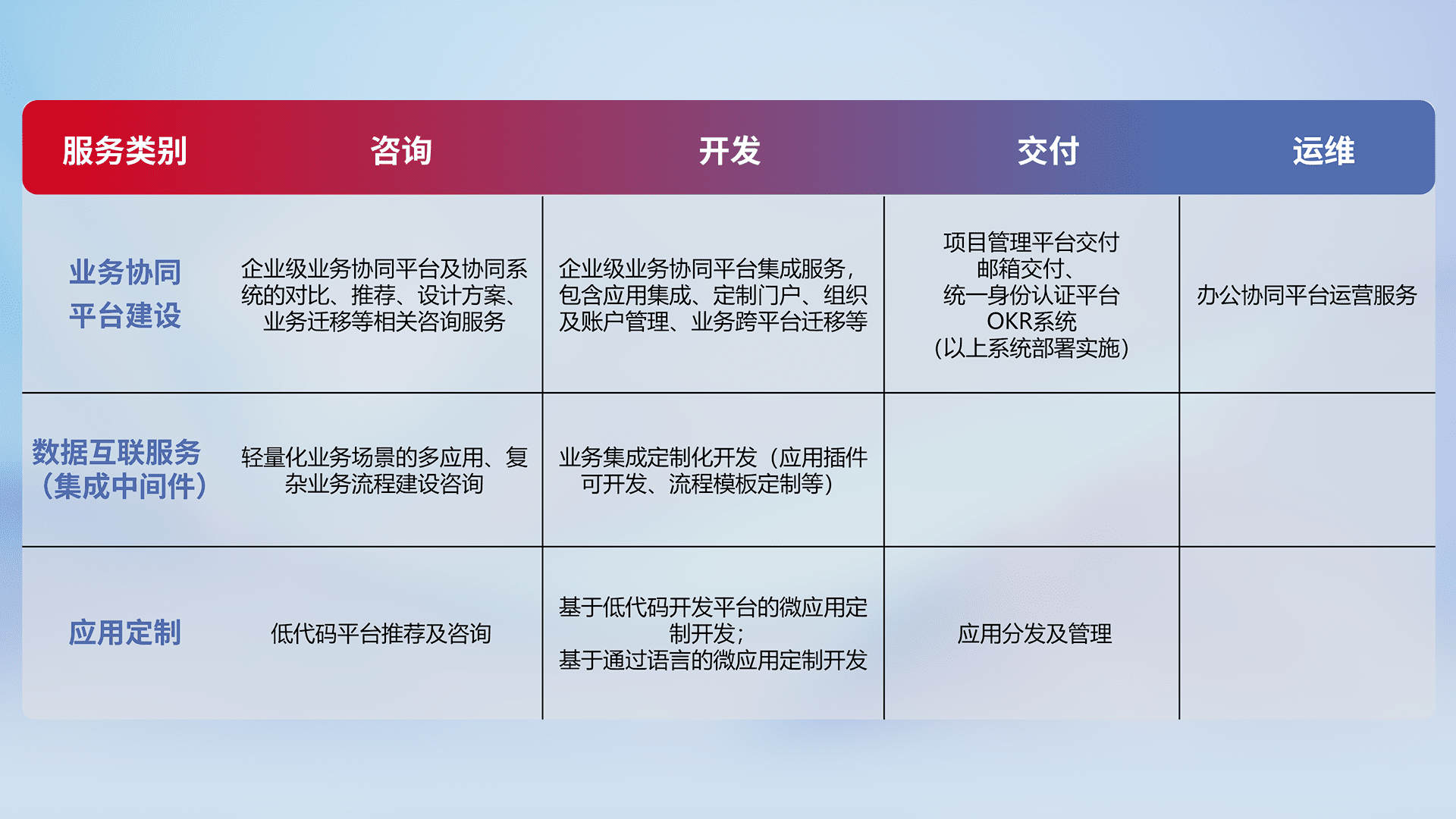 针对钉钉、、企微、、、、IDaas等平台级产品提供产品的规划、、、方案、、、交付、、、定制化开发等服务,,,实现如统一协同办公、、、智能客户服务、、、混合会议管理、、、智能数据查询、、、、等业务场景,,,实现数字化转型。。。